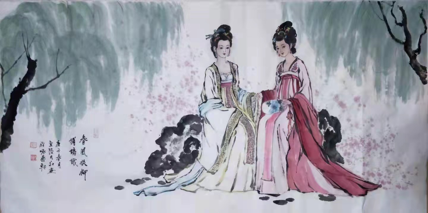 陆月红画路宽广,其笔下不仅有大气磅礴的阳刚之作,更有浪漫抒情的仕女题材。《此物最相思》《红楼十二钗》《踏雪寻梅》《爱莲图》《唐人马球图》等作品,画家在抓住每个人的动作及表情中,深度刻画人物性格特征和内心情感。展开这些具有东方诗意的作品,美轮美奂,沁人心脾。画中情景,或寄情山水,宁静致远;或清风赏荷,丽人踏春;或寻花归来,活力满怀。画家努力营造其作品的趣味性,使其浑然有势。通过挖掘内心世界展现人物性格,让人从作品中既感悟到她深厚的绘画功力,又感悟到她的生命激情。
